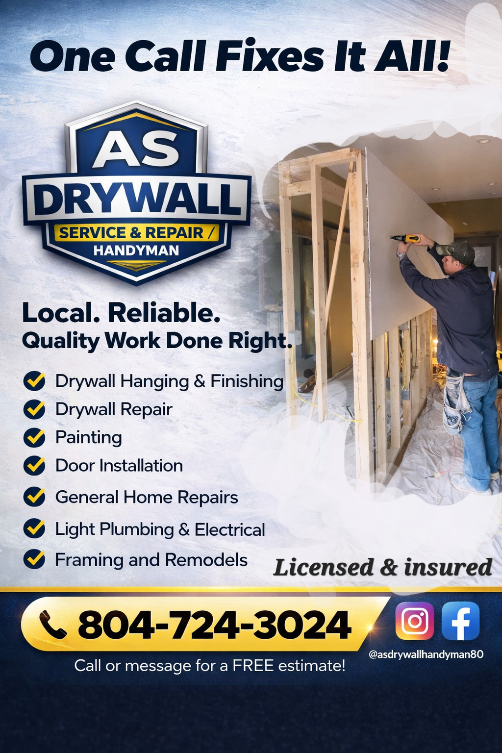 Welcome to AS Drywall Service and Repair/Handyman, your trusted partner in Maryville, Tennessee, and surrounding counties for all your home improvement needs. We specialize in top-quality drywall installation, finishing, and repair, ensuring a flawless foundation for your spaces. Beyond drywall, our skilled handyman services cover everything from minor electrical and plumbing to painting, general home repairs, upkeep, and even landscaping. We are a new business committed to delivering exceptional craftsmanship and reliable service, making your vision a reality. Join us as we build beautiful, functional homes together.